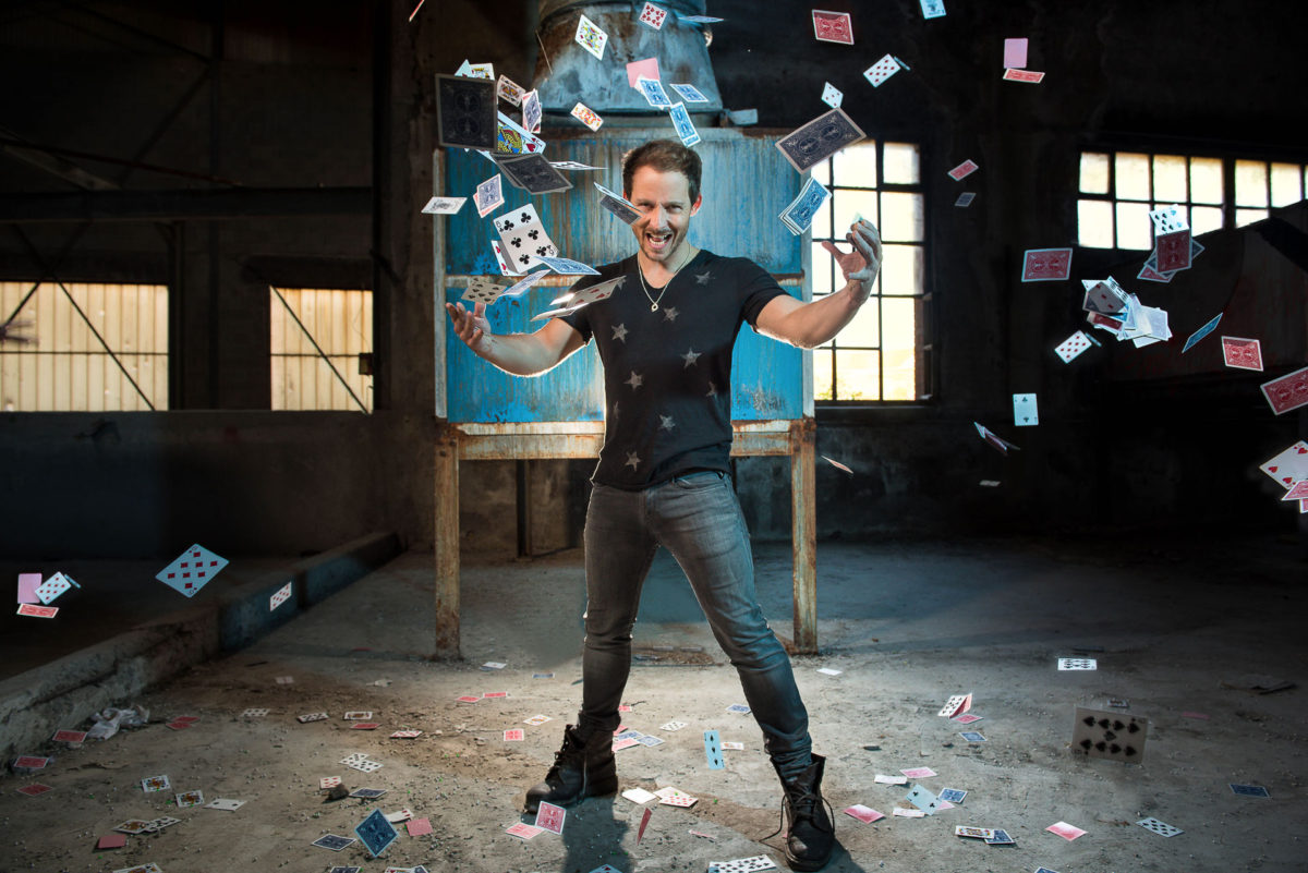 Shooting photo d’Éric Borner, magicien illusionniste : entre jeu d'ombre, de lumière et de poussière.