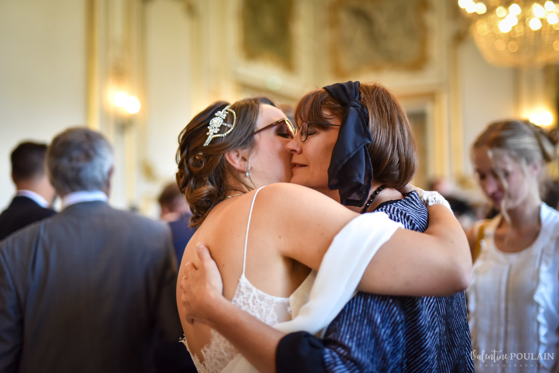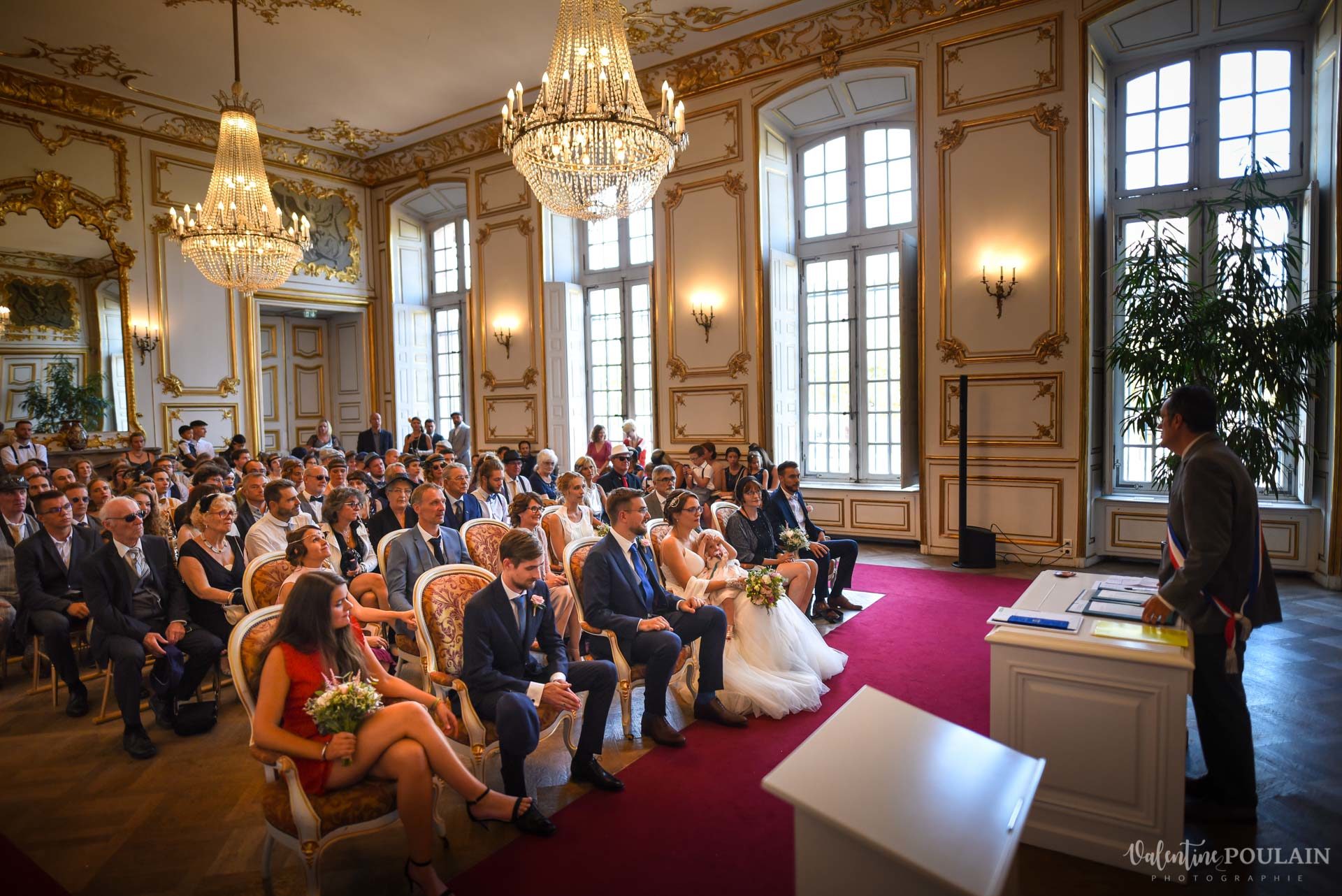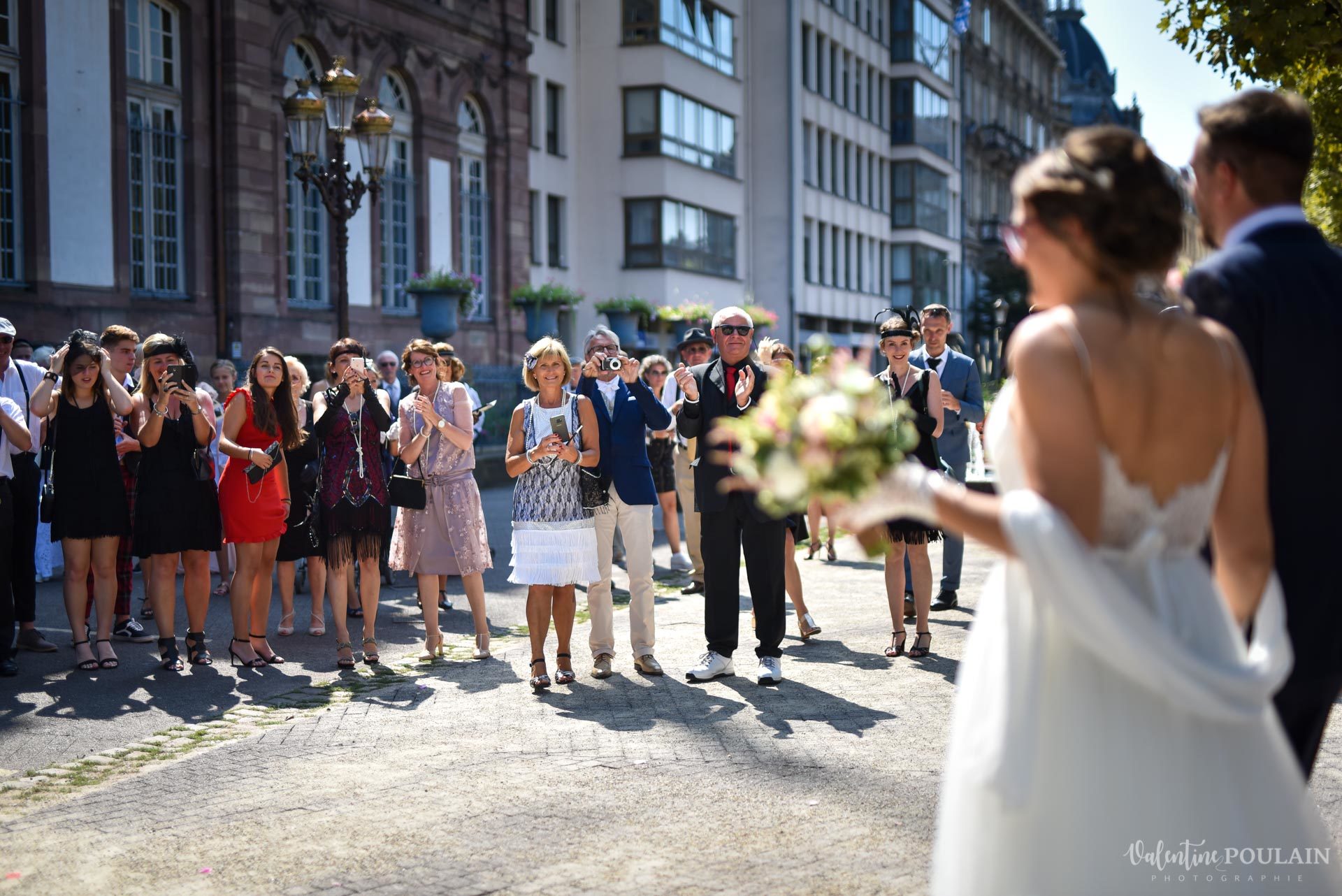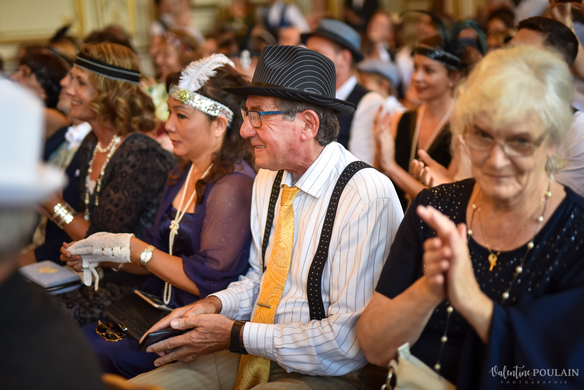 A l’arrivée à la mairie de Strasbourg, nos amoureux ont découvert que tous leurs proches avaient joué le jeu. Les espérances du couple étaient comblées, le thème avait été respecté, la cohésion entre les invités était là ! Pour les hommes : bérets, chapeaux, montres à gousset et costumes 3 pièces. Pour les femmes : robes à paillettes et autres robes charleston,… perles, noeuds, plumes et franges étaient au rendez-vous et ça leur allait à ravir.