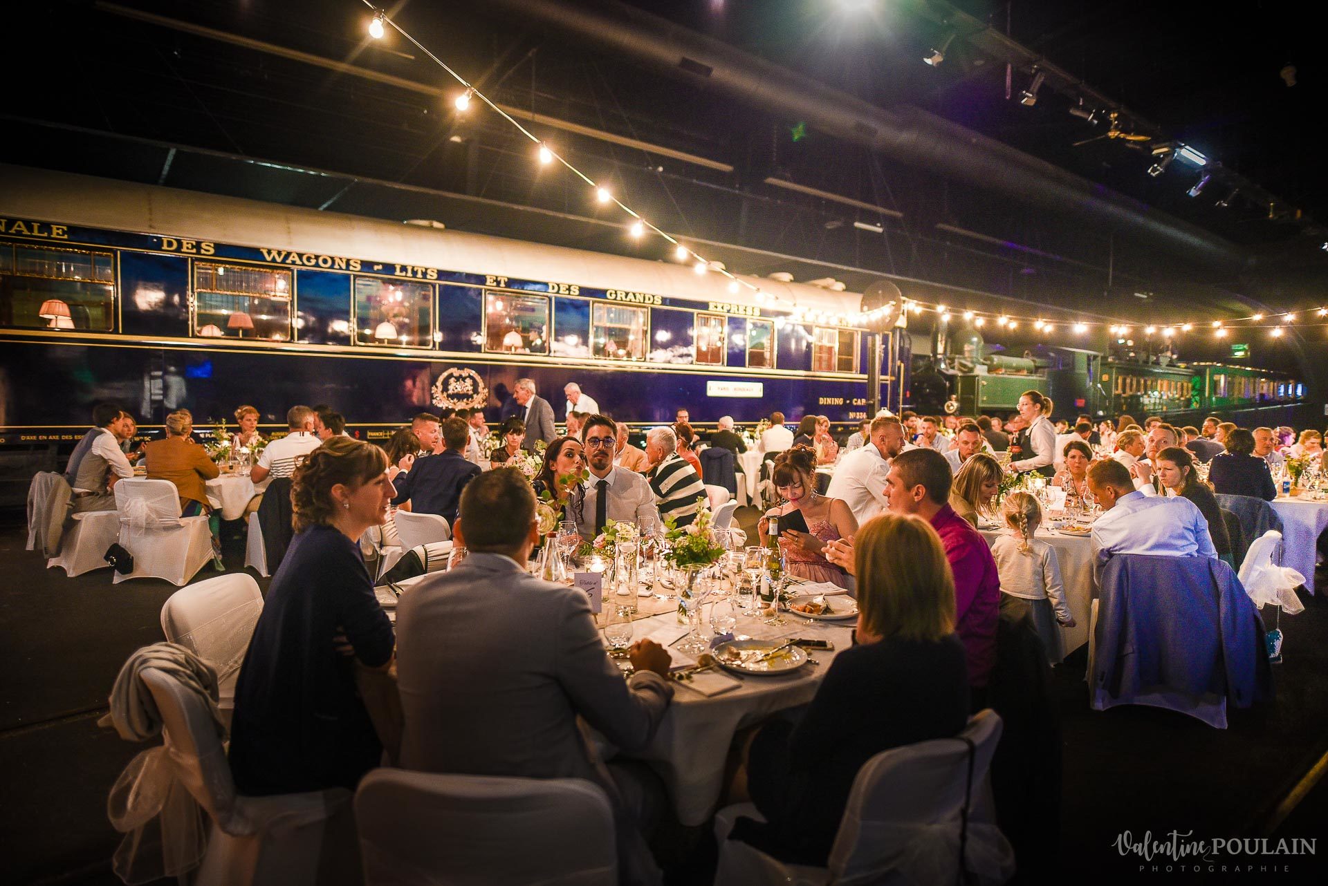 La particularité de ce lieu de réception, c’est l’ambiance cinématographique dans laquelle on est plongé dès notre arrivée. La séance photo de couple s’est déroulée en pleine gare et dans les wagons de pièces de collection. Vous verrez que certaines photos en noir et blanc sont hors du temps et que ces deux-là semblent tout droit sortis d’un film de cinéma. L’apéritif s’est déroulé entre les locomotives et le repas sur les quais, au pied du mythique Orient-Express. C’est pas la classe ça ? En fait, nous étions tous plongés dans une obscurité qui invite au voyage dans le temps. J’en profite pour vous rappeler qu’un bon éclairage peut changer toute l’ambiance de votre mariage. Marie & Anthony ont opté pour des guirlandes lumineuses pour le côté festif. Le résultat était splendide. Pssst ! Je vous dévoile toutes les astuces d’éclairage de vos soirées de mariage dans cet article : « 7 astuces pour des photos « pas comme les autres. »