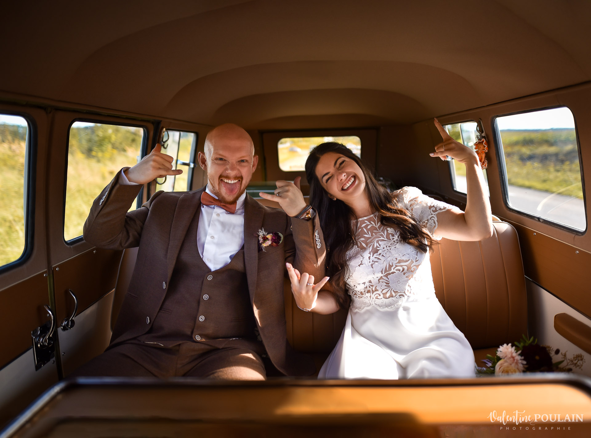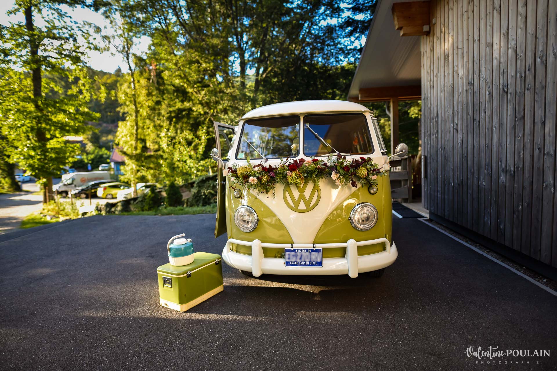 Alexandra et Tanguy ont opté pour un Combi VW vert, pour apporter une petite touche rétro à leur journée.